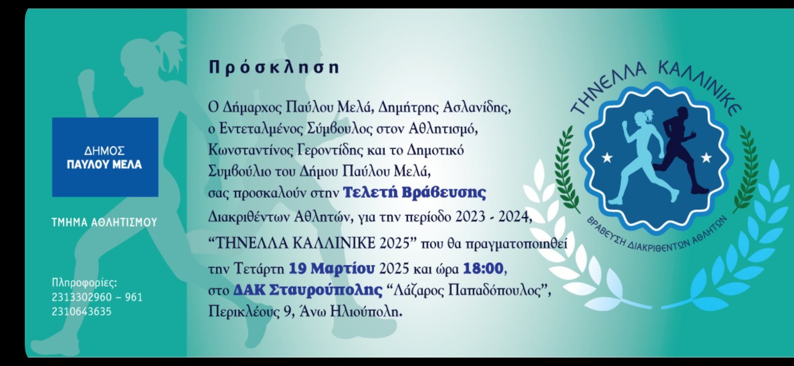 Την Τετάρτη 19 – 3 – 25 ο Δήμος Παύλου Μελά θα βραβεύσει τους αθλητές μας που διακρίθηκαν. (Δεν είναι πολλοί,γύρω στους τριάντα!!!). Ώρα προσέλευσης 17:30. Διεύθυνση Περικλέους 19, Σταυρούπολη 564 31. Παρακαλείστε να παραβρεθείτε όλοι.